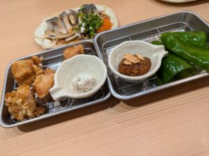 唐揚げ、炙り〆サバポン酢、肉味噌ピーマン